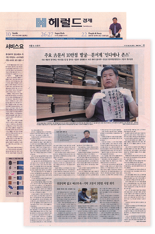 장서각의 민간 고전적 기증기탁의 의미와 필요성을 전하기 위해 고문서연구실 안승준 실장의 인터뷰를 헤럴드경제를 통해 진행했습니다. 사진기자와 함께 직접 장서각을 찾은 이윤미 부장은 1시간이 넘는 인터뷰 시간 동안 안승준 실장에게 고문서 수집사업에 대한 에피소드와 그에 얽힌 의미를 들으며 감탄을 이어갔고 그 과정을 기사에 모두 담아냈습니다. 이 내용은 온라인 공개를 거쳐 23일자 1면 타이틀에 아이콘으로 안내되었고, 광고 없는 전면 기사로 실려 더욱 볼륨감있게 전할 수 있었습니다.
