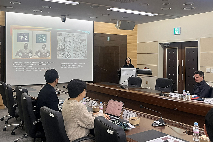 La professeure We Jung Yi (Université Vanderbilt) a proposé une communication intitulée « Re-mémorisation postcoloniale ? Le retour des héros diasporiques dans la péninsule coréenne post-guerre froide ». À travers une analyse comparative, elle a étudié la manière dont deux figures diasporiques, le catcheur Rikidōzan et la révolutionnaire Alexandra Petrovna Kim, sont reconfigurées comme objets de mémoire culturelle dans la Corée du XXIᵉ siècle. Son travail explore les processus de reconstruction postcoloniale de la mémoire diasporique dans un contexte de recomposition identitaire et géopolitique.